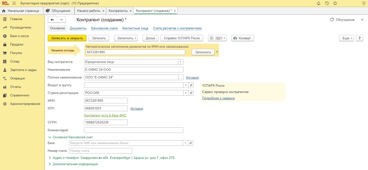 Быстрая проверка информации о контрагентах, автоматическое заполнение реквизитов контрагентов по ИНН и другие полезные функции.