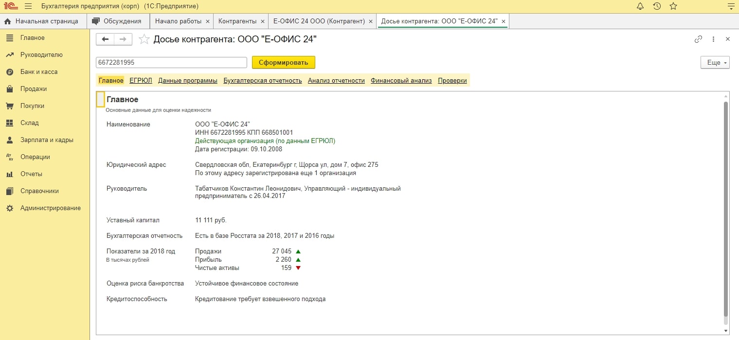 Все сведения являются актуальными. 1С:Контрагент получает данные через интернет, что позволяет экономить время и место
