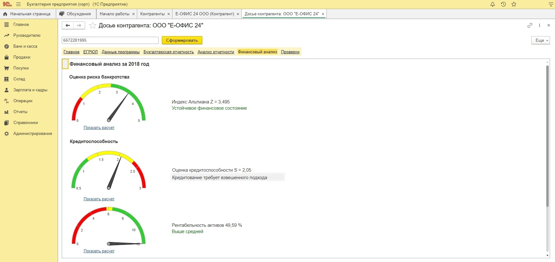 Отчет позволяет провести оценку финансового положения организации, увидеть данные о массовости юридического адреса, информацию об учредителях контрагента и о связанных лицах, информация о его бухгалтерской отчетности. Также «1С:Контрагент» проводит анализ отчетности за 3 года, рассчитывает чистые активы, определяет финансовое положение компании по 4 критериям, в том числе оценивает кредитоспособность контрагента.
