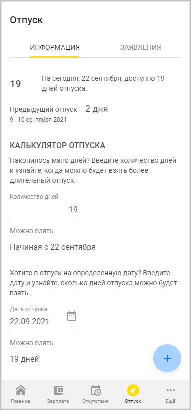 - просмотр остатка отпускных дней и подача заявлений на отпуск