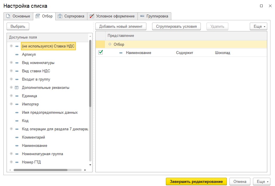 Для поиска используется кнопка «Настроить список» на Панели инструментов, которая открывается при нажатии кнопки «Ещё» в правом верхнем углу. В окне отбора необходимо установить параметры (условия). В поле «Доступные поля», выбрать «Наименование» (кликнуть два раза левой клавишей мыши). В поле «Отбор» появится строка «Наименование», установить необходимые параметры (условия) и нажать кнопку «Завершить редактирование» (см. Рис.1)