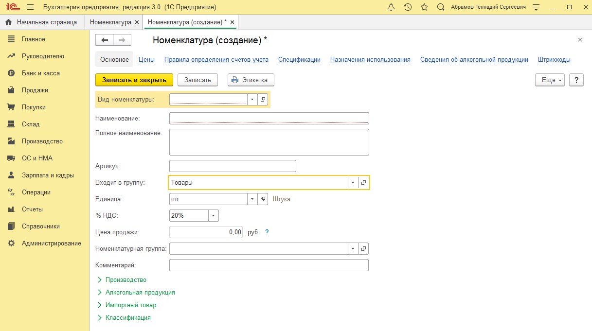 Для того, чтобы добавить новый элемент воспользуемся кнопкой «Создать». Откроется окно «Номенклатура (Создание) *» (см. Рис.3).