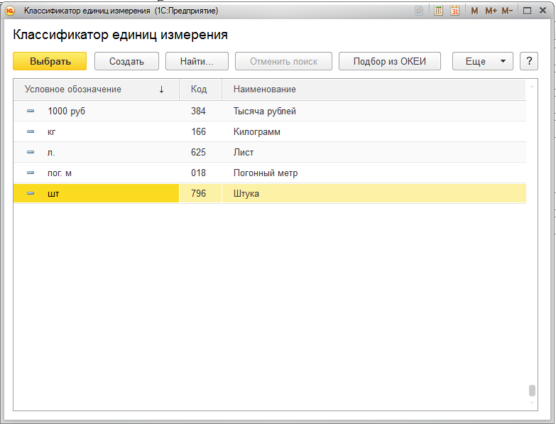 Для того, чтобы добавить в классификатор новый элемент, лучше всего использовать подбор данных из общероссийского классификатора единиц измерения (ОКЕИ). Это позволит выбрать данные из общепринятого условного обозначения и в дальнейшем использовать общероссийское сокращение, например, «кг» - килограммы и т. п. Для подбора из классификатора используется кнопка «Подбор из ОКЕИ» (см. Рис. 5).
