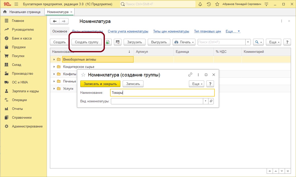 В появившемся окне в поле «Наименование» вводится название группы, например «Товары». Строку «Вид номенклатуры» не заполняем. Поле «Код» заполняется программой автоматически. Это порядковый номер нашего объекта. Программа сама присваивает каждому объекту код. Менять код не рекомендуется. Чтобы сохранить запись, нужно нажать кнопку «Записать и закрыть». Окно закроется, а в справочнике появится новая группа.
