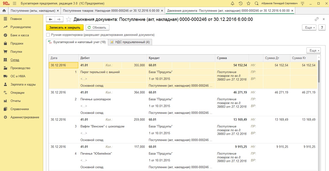 Кнопка «Провести» проводит документ, т.е. формирует движения, которые регистрируются этим документом. Например, выбранный нами документ регистрирует покупку сахарного песка. Если документ провести, то информация о закупе сахарного песка окажется на складе. Если не провести - ее там не будет.