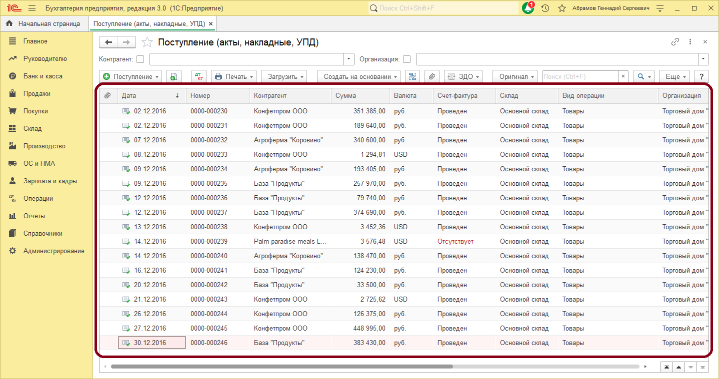 Рис.1. Список документов «Поступление (акты, накладные, УПД)»
