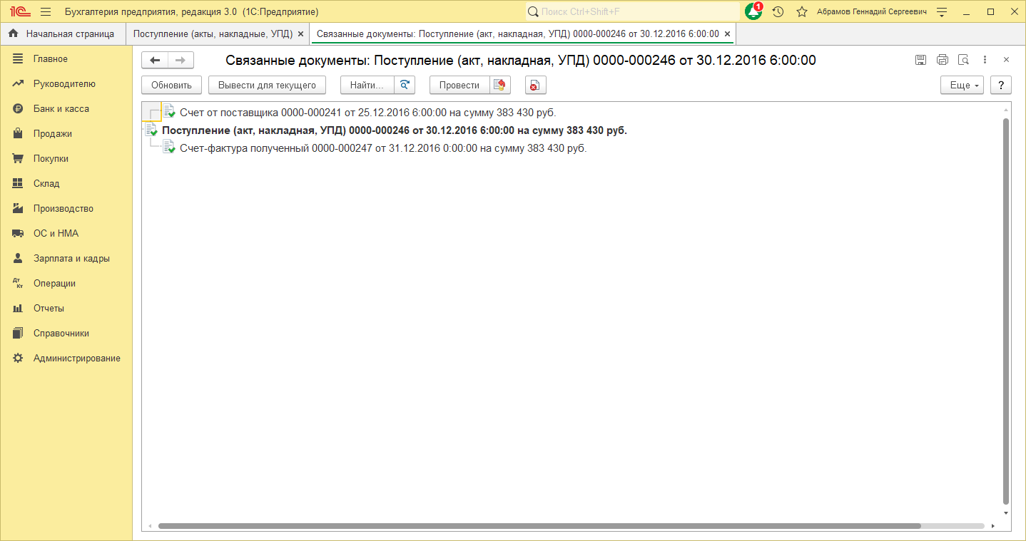 Перейдите в раздел «Покупки» и откройте «Поступление (акты, накладные, УПД)».Откроется список документов (см. Рис.1)