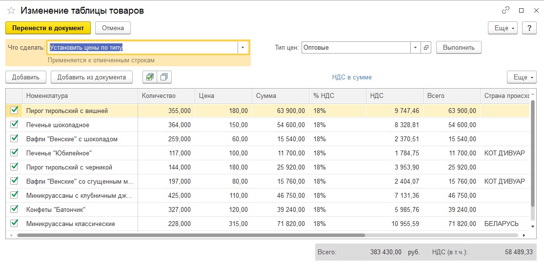 При нажатии на кнопку «Изменить» открывается дополнительно окно, в котором выбираются строки для внесения изменений - отмечаются флажки. Флажок отмечен - позиция выбрана для изменения, если флажок убрать - изменений по позиции не будет. В нашем примере изменяем все позиции табличной части (см. Рис.6)