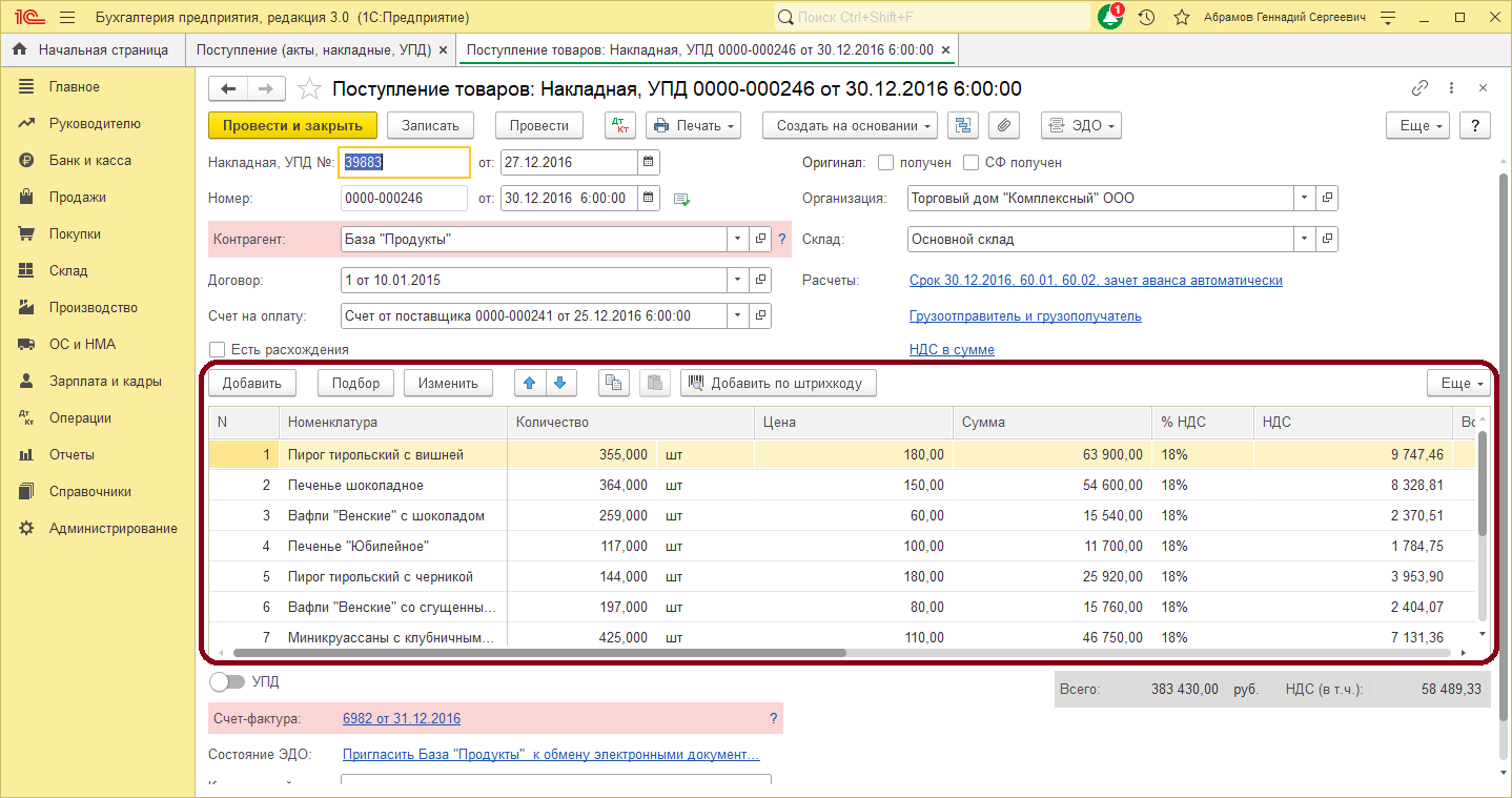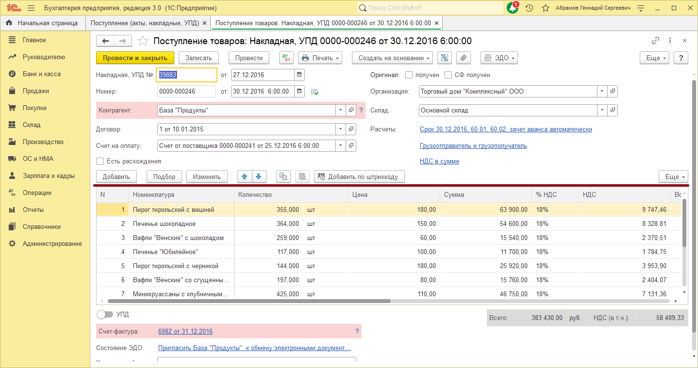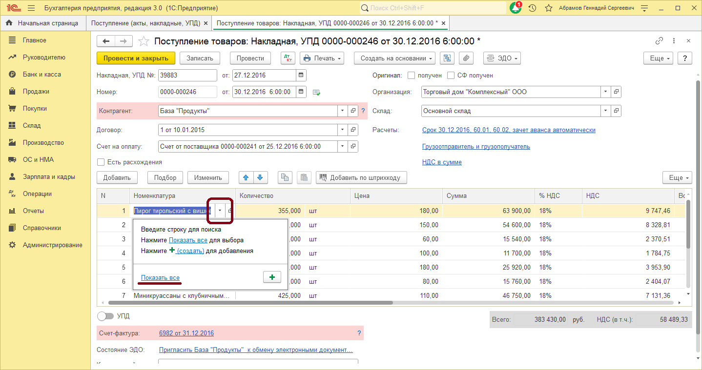 Рис.1. Документ «Поступление товаров и услуг»