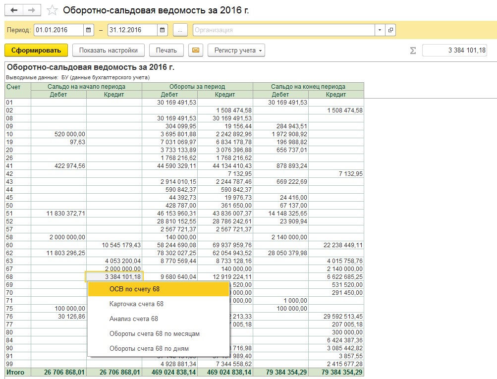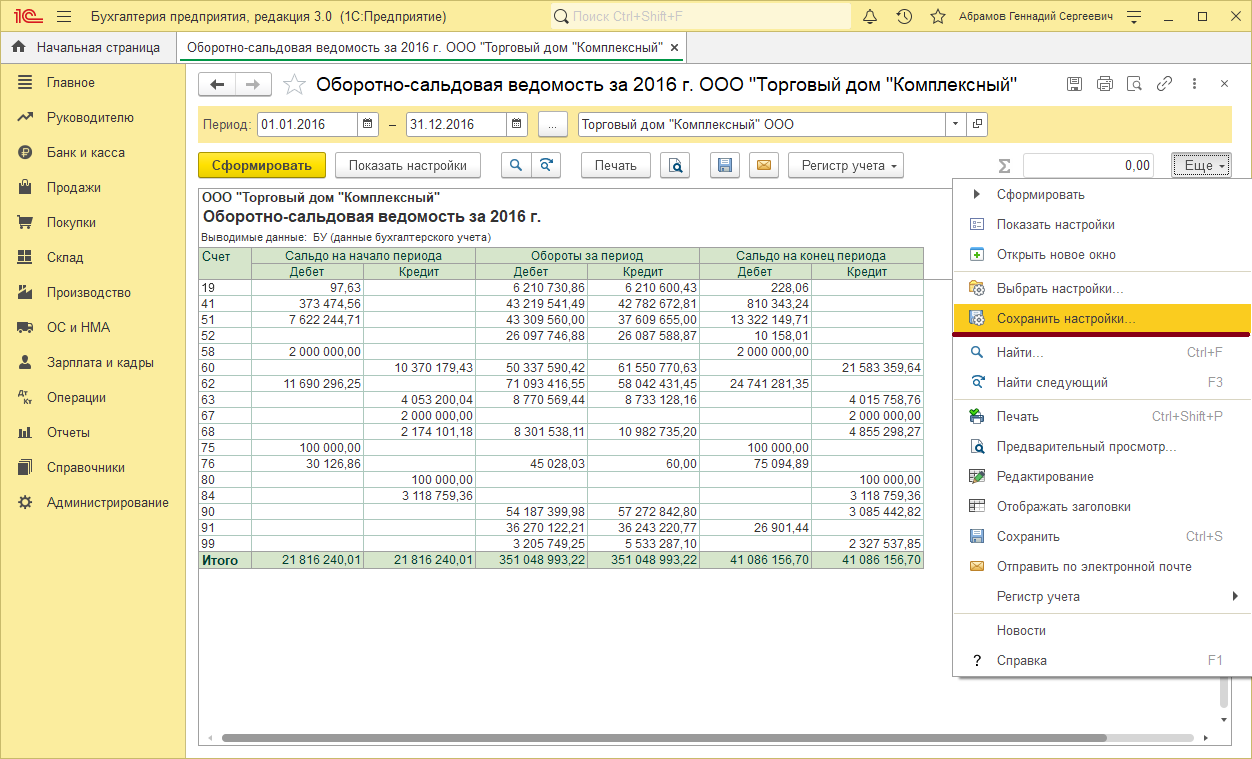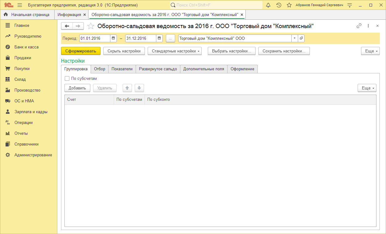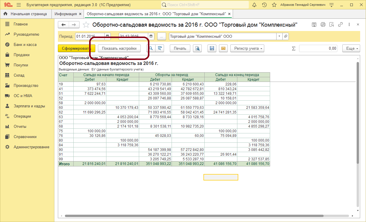 В процессе работы часто возникает необходимость выполнить настройку отчета. Настройка отчета предполагает: добавление или исключение из отчета определенных полей, подключение или отключение полей из группировки или отбора данных по некоторым полям. Чтобы посмотреть настройки, в программе «1С:Бухгалтерия предприятия» выберите отчёт «Оборотно-сальдовая ведомость», в строке «Период» задайте даты 01.01.2016 и 31.12.2016 и нажмите «Сформировать». Мы сформировали оборотно-сальдовую ведомость за 2016 г.