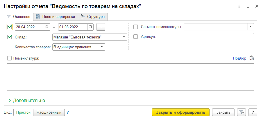 Рис. 5. Окно Настройки отчета «Ведомость по товарам на складах»
